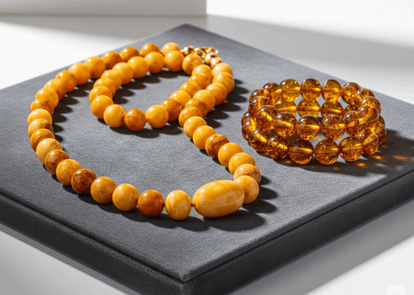 Farbe: Die Farbe von Bernstein variiert stark. Sie reicht von fast Weiß, über verschiedene Gelb- und Brauntöne (oft honigfarben, cognacfarben, zitronengelb), Orange, Rot bis hin zu seltenen Grün- oder Blautönen. Die Farbe "Butterscotch" (Butterkeks) bezeichnet eine opake, oft cremige bis gelblich-braune, undurchsichtige Variante.